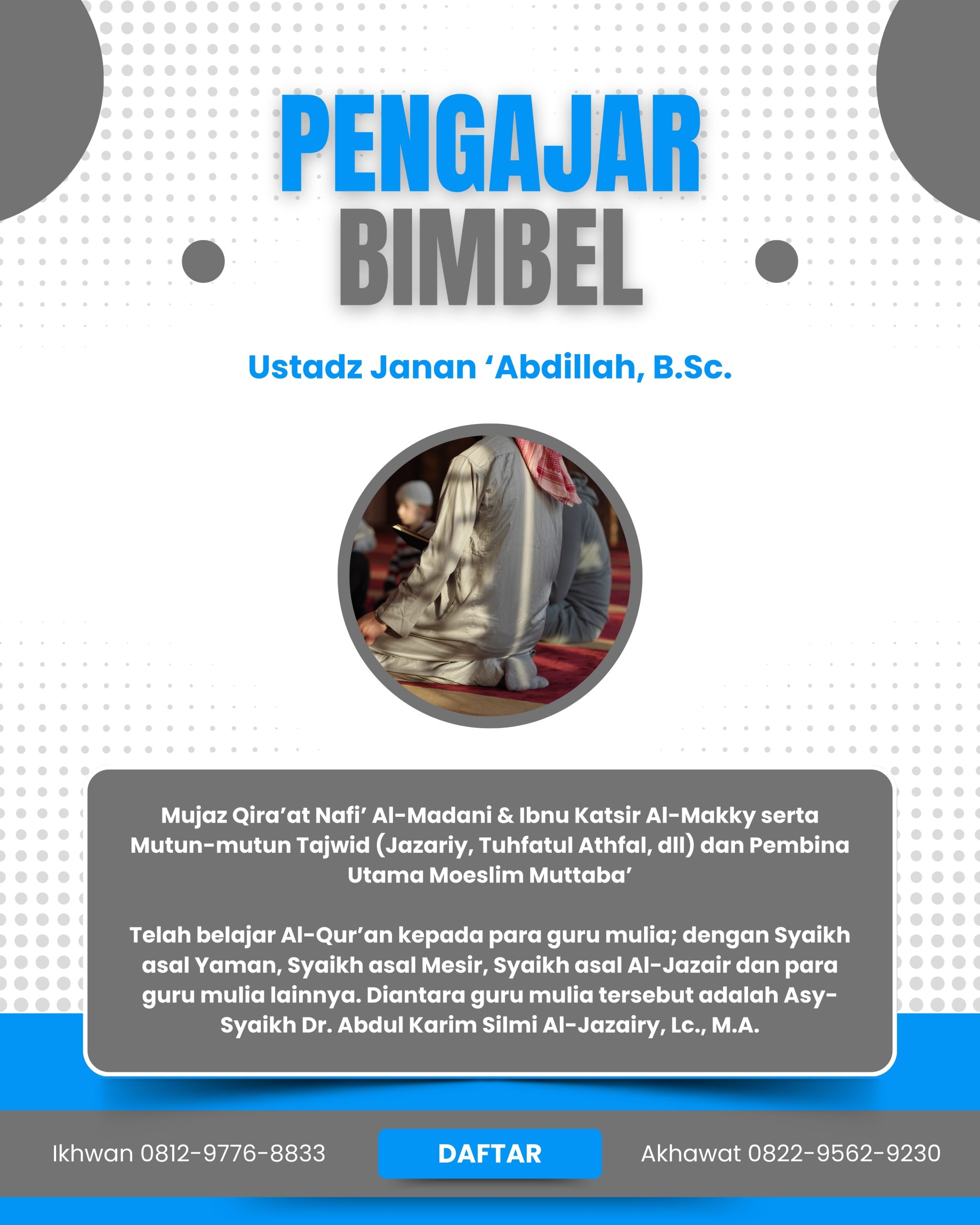 Dan Alhamdulillah, Moeslim Muttaba’ kini telah resmi membuka program study bimbingan belajar Al-Qur’an Al-Karim Privat & Intensif, belajar dari dasar hingga mahir bersama founder MM langsung; Ustadz Janan ‘Abdillah